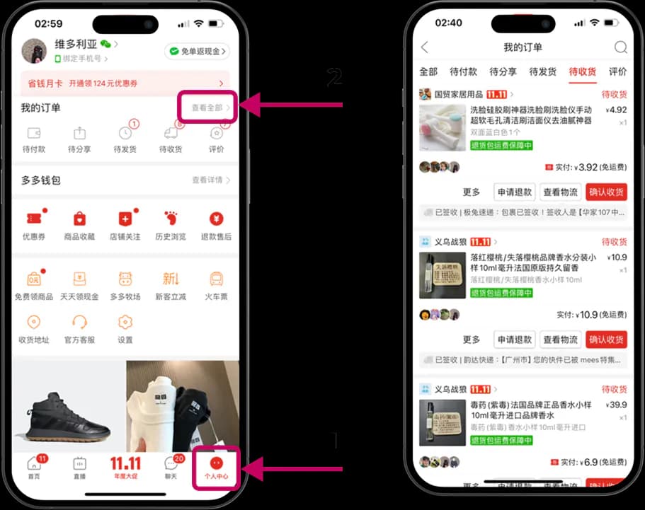 Перейдите в личный кабинет Pinduoduo (иконка человечек) (1), зайдите в данные блока «История заказов» (2), после чего в списке выберите товар, который необходимо вернуть